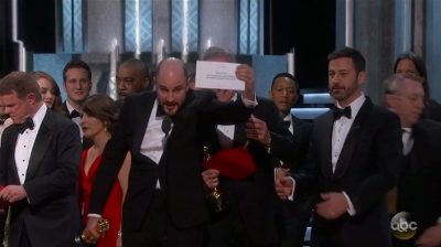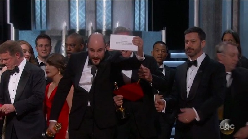 Celý filmový štáb přišel na scénu a začal dělat projevy o velkém vítězství, ale po několika minutách muž vstoupil, aby správnou složku s názvem skutečného vítěze: Moonlight Movie. Byl producentem filmu, Jordan Horowitz, který oznámil zprávu pro veřejnost, představující správnou kartu.