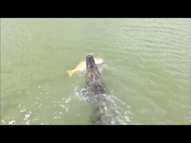 V US Floridě, člověk chytí velkou rybu, ale aligátor se objeví z ničeho chytit snadnou kořistí.