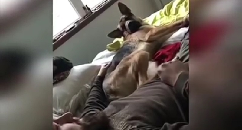 Německý ovčák dává dobrou lekci svému šéfovi, obtěžuje gargalontas nohu.