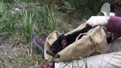 Výzkumník David Hamilton uvolňuje Tasmánský ďábel na ostrově Tasmánie, Jižní Austrálie. konečně zdarma, vačnatce dělá své první kroky v přírodě, ale okamžitě přejde do pasti.