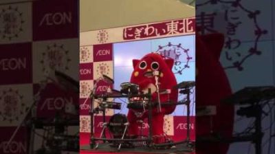 Japonský maskot provedením death metal bubnování pro dětskou píseň.
