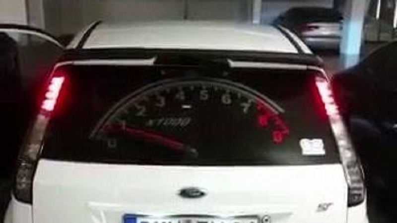 Někdo instaloval obrovský tachometr v zadním okně Ford Fiesta. Stěrače působí jako jehla pohybuje v závislosti na otáčkách motoru.