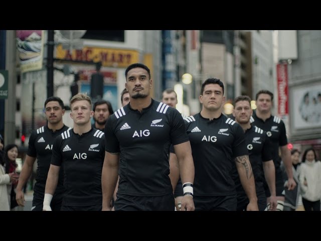 Národní rugby tým Nového Zélandu, také známý jako 'All Blacks', On cestoval do Japonska v Tokiu, aby se tacklers kolemjdoucí. Reklama na pojišťovny AIG pojištění v Japonsku.