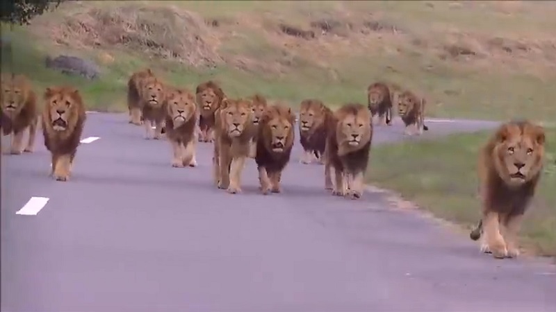 Lvi „defilují“ za džípem s turisty.