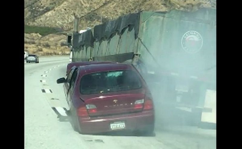 Na silnici 15 v Kalifornii, řidič kamionu i nadále řídit po dobu delší než šest kilometrů, aniž by si uvědomil, že Nissan Maxima visel na jednom z přívěsu přívěsy.