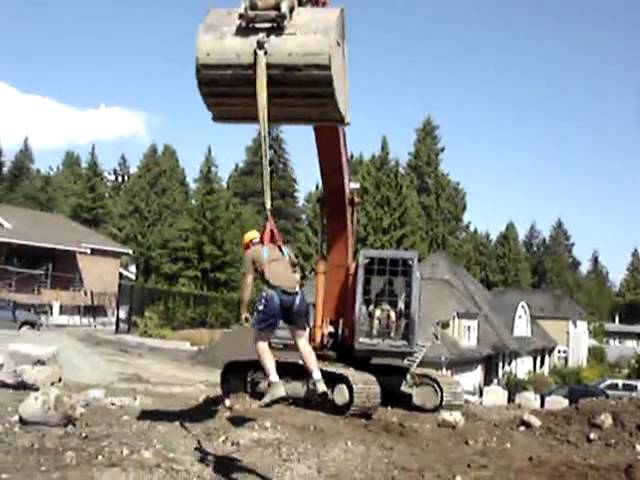 Po dlouhém dni na místě, pracovník rozhodne pobavit s bagrem.