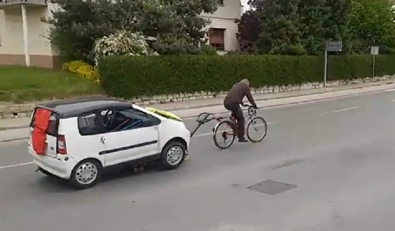 V ulici Chorvatska, starší tažné poškozené auto, tahání na kole.
