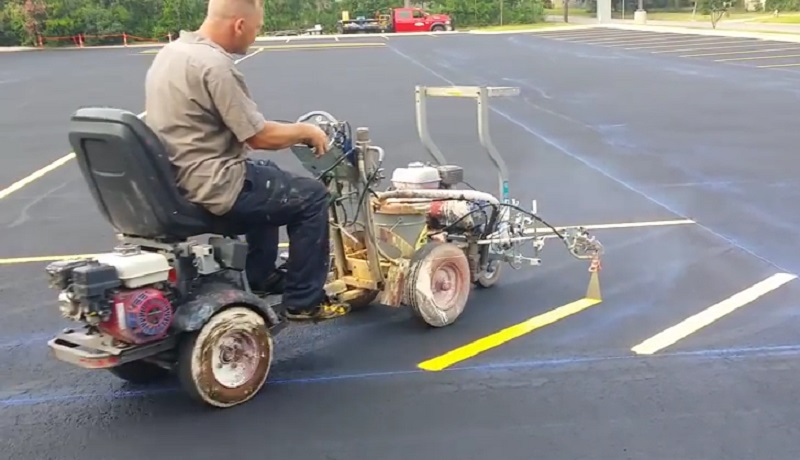 Robert, zkušený profesionální silniční prokládání, vytváří žluté značení na parkovišti s maximální přesností, pomocí invalidního vozíku 3900 linelazer.