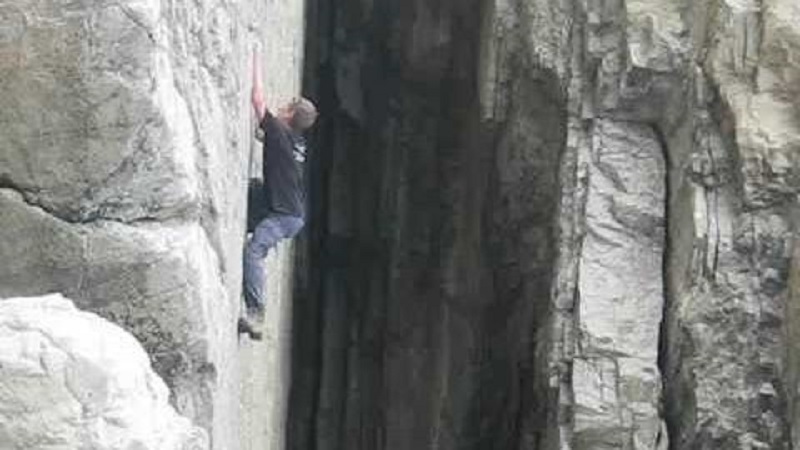 Volný horolezec bez zabezpečovacího zařízení, lezení na svislé skále, když se náhle ztratí sevření. Naštěstí, zdá se, že má zvýšený smysl pro rovnováhu… :)