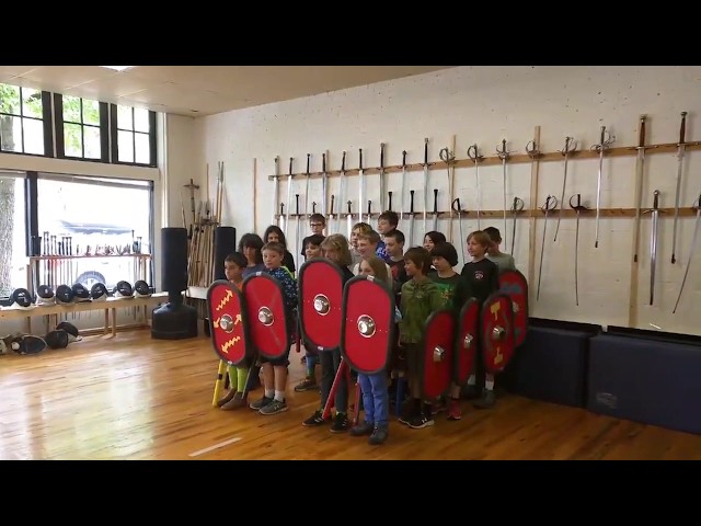 Malé děti představují „želví formaci“ římských legií, V průběhu bojových umění škole Northwest oplocení akademie, Ve Spojených státech Oregon.