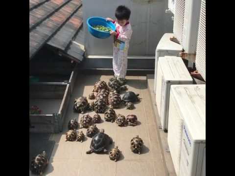 Desítky želv shromáždit kolem malého chlapce, připravuje krmivo zeleninu.