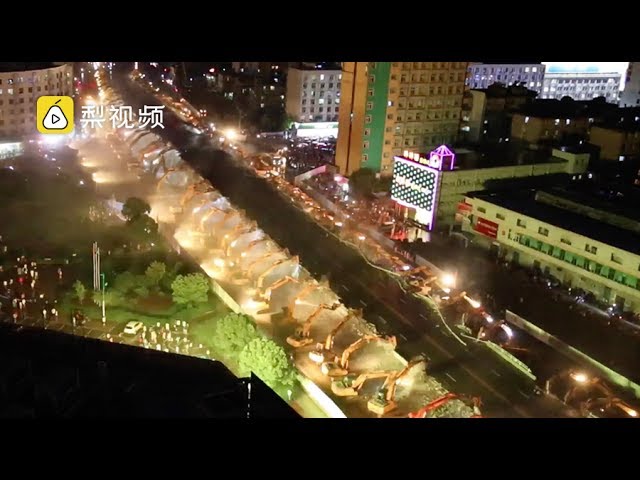 Nanchang City China, 200 rýpadla pracoval současně strhnout nadjezdem čtyři proužky a cca 600 metr, přes noc.