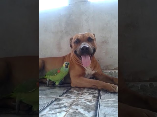 Město Pedrinópolis Brazil, Perigo pitbul a Cassio papoušek hrát přátelé. Obě zvířata vyrostla dohromady a mají speciální přátelské vztahy mezi nimi.