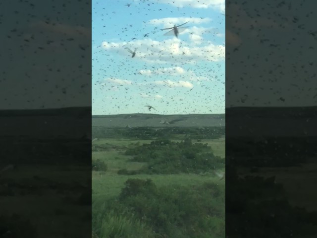 Dne 19. července 2017 ve východním Kazachstánu, auto prochází masivní roj kobylek, vytvořil mrak na nebi.