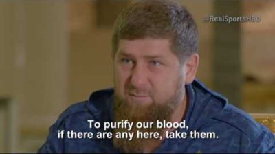 V rozhovoru s USA sportovní novinář Bryant Gumbel (HBO) na bojové sporty, Čečenský prezident Ramzan Kadyrov řekl: 'Jestli tam jsou gayové.' [v Čečensku], vzít je do Kanady. Prosím, Bože, vzít, takže nemáme je tady. Očistit naši krev. Pokud existují, vezmi je. “ „Lidé jsou svědectvími o mučení za homosexualitu čečenskou policií,' pokračuje, 'Jsou to ďábel.'. Musíme se jich zbavit, nejsou muži... Bůh je trestá za to, co nás obviňují. Budou muset zodpovídat před Všemohoucího. '