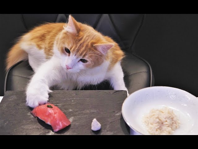 Japonská června dělá gurmánské jídlo pro kočky, sushi a kuřecí.