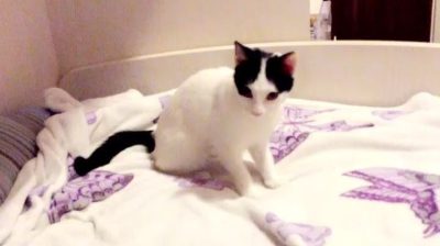 Kočka ukazuje její talent v herectví, když majitel, předstírá, že výhonky.