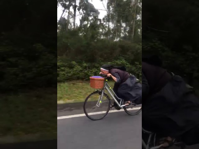 Při cestě do Santiaga de Compostela ve Španělsku Fisterra, motorista vidí jeptišku v aerodynamické pozici na kole. ve sjezdu, řádová snaží rychlosti a nakloněné čelní tělo má nejmenší z odporu vzduchu.