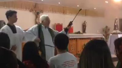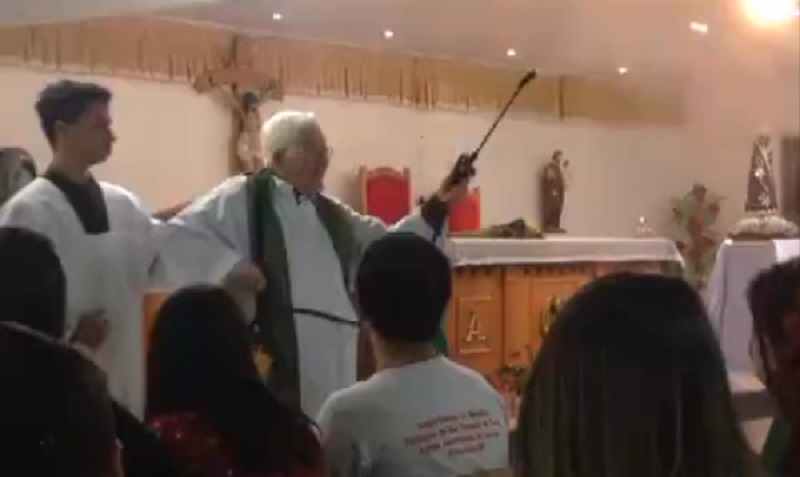 Kněz inovační, házením svěcenou vodu za použití přenosného postřikovače.