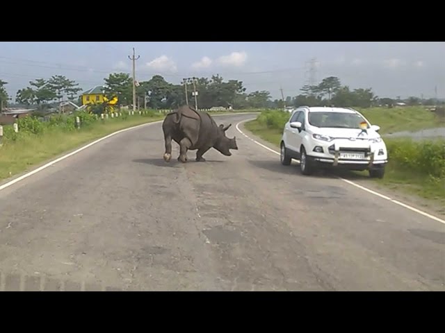 V Assam stát v Indii, motorista zaznamená rhino putování na ulici. Nosorožec útočící motoristé, který splňuje, nutit, aby se couvání. Po několika minutách, zvíře se nachází v přední části dvou malých autobusů a raději ze silnice spustit na louce.