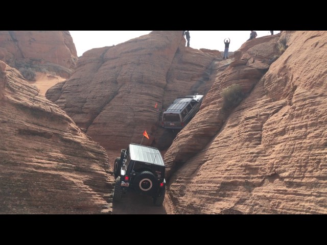 Řidič v Jeepu Cherokee dokáže vyšplhat velmi strmé skalní stěny v parku Sand Hollow, v Utahu v USA.