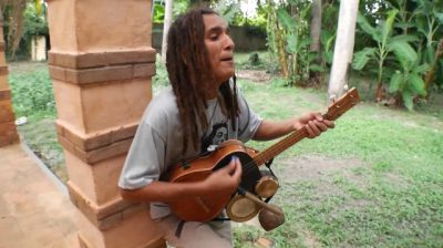 Brazilský putování hudebník Kristoffer Andarilho hraje na kytaru a bicí zároveň, Díky směsici písní Boba Marleyho.