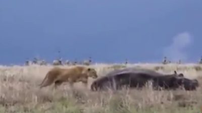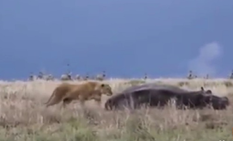 Lvice se pokusí zaútočit na hrocha, který leží na zemi, ale brzy bude litovat.