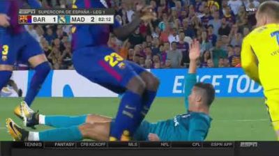 Cristiano Ronaldo vzal červenou kartu (Po 2 žluté zasloužila) Na konci zápasu Barcelona-Real Madrid dne 13. 08. 2017. Hvězda reálného nelíbilo této sankce a informoval rozhodčí tím, že strčí ji.