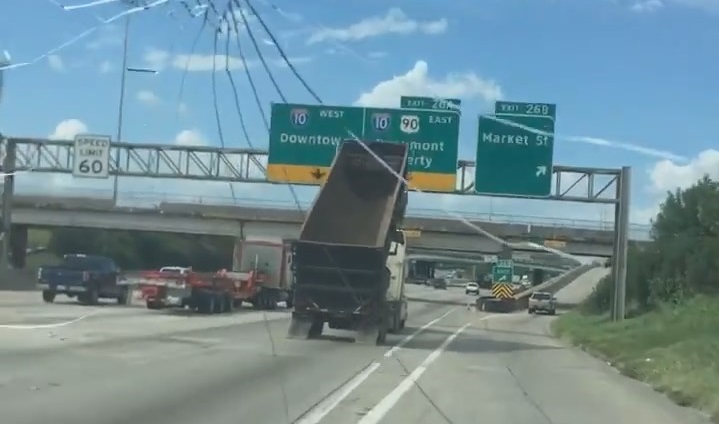 Sklápěč s vyvýšenou kbelíku srážce s velkým horizontálním billboard na dálnici v Houstonu ve Spojených státech.