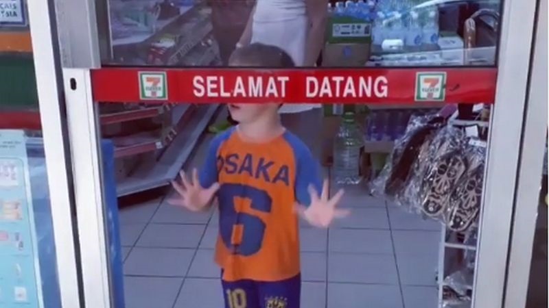 Malý chlapec se snaží tlačit skleněné dveře se dostat ven z obchodu. Dveře nemá žádné sklo v dolní části, a ten malý bude mít srandovní nehody.
