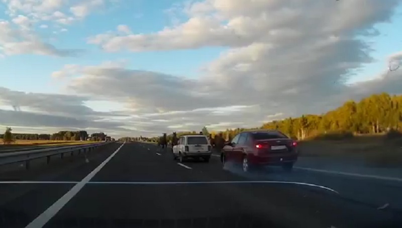 Dne 17. září 2017 v městském silnici Čeljabinsku v Rusku, stádo divokých koní běží uprostřed silnice a příčina nehody mezi dvěma vozy.