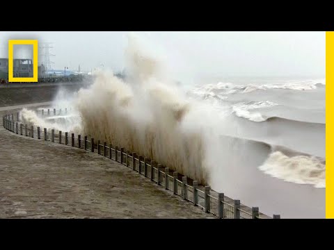 V jev se nazývá přílivové otvor, Obrovské vlny spěchají jako tsunami, proti proudu řeky Qiantang v Číně.