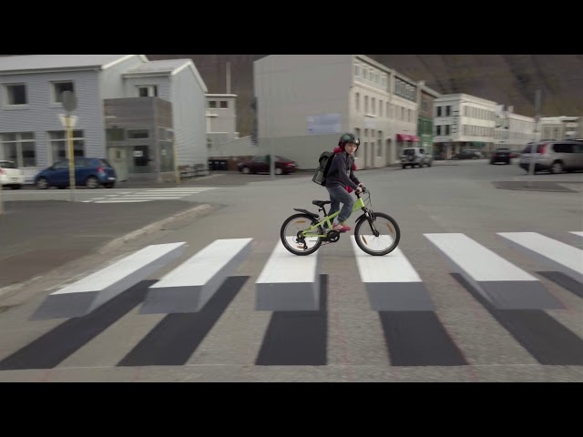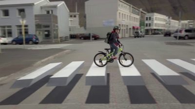 Trojrozměrné přechod pro chodce namalované na městské ulici Ísafjörðuru na Islandu, jež by řidiči zpomalit.