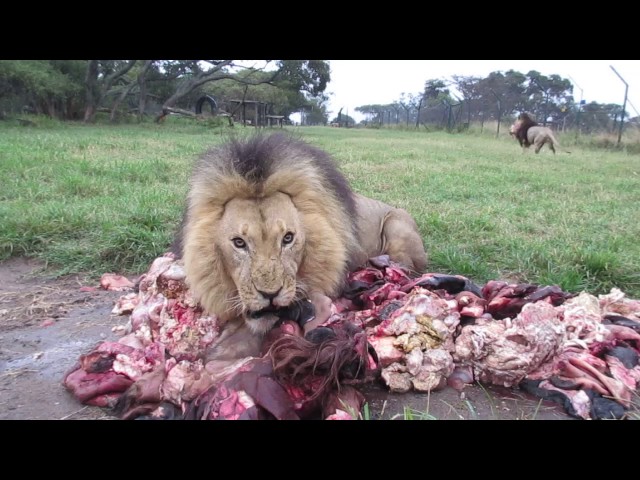 Je stolování pro Lions v Antelope Park, v Gweru Zimbabwe. Tři muži lvi přejet potraviny a dva z nich dostat sousto, Zatímco třetí, nepochybně vůdce, chrání své jídlo s odhodláním. Nejlepší, aby se někdo obtěžuje!