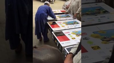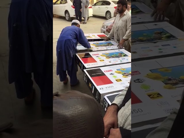 Obchodník v Pákistánu Tisknout logo Sony Bravia pár velmi levné a anonymní televizory.