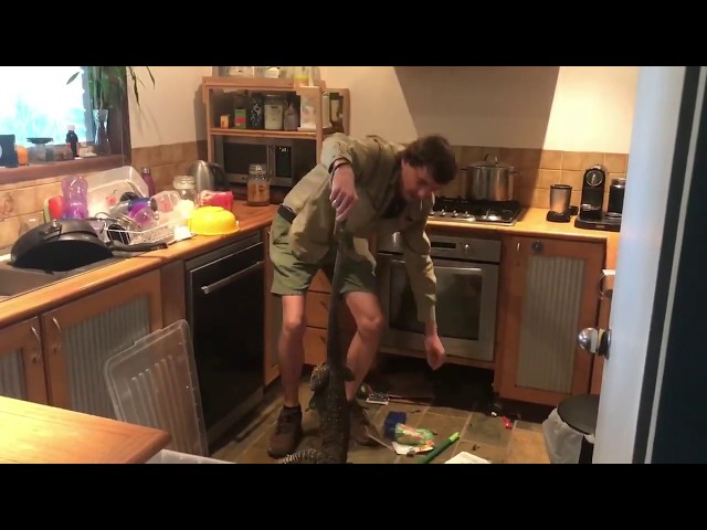 2. listopadu 2017 v Queenslandu v Austrálii, člověk najde velkou ještěrku (Varanus) která je skryta pod troubou v kuchyni.