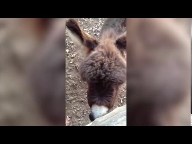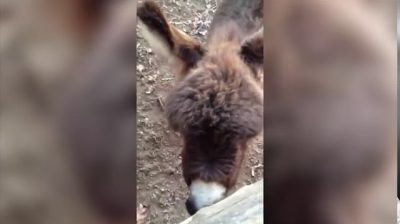 Dívka říká máma, že osli nekoušou a jak je krmit bez obav. Zdá se, že jeden z nich slyšel a chtěl dělat show.