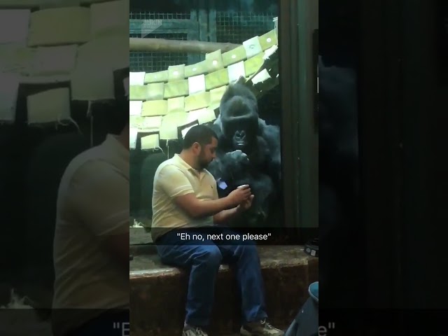 V Zoo, muž deicheni fotografie ze svého mobilního telefonu, aby gorila. Gorila umožňuje manuální podpis tah, když chce vidět další fotografii.