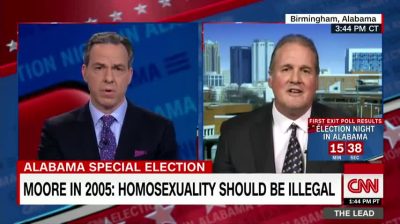 CNN Jakes Tapper skutečnost kontroluje Roy Moore kampaň mluvčí Ted Crockett, kteří nepřesně tvrdí, že křesťanská Bible musí, zákonem, použít, pokud byl místopřísežný do kanceláře.