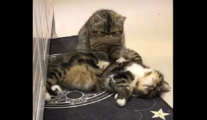Kočka dělá masáž pro svou přítelkyni, relaxační ležící.