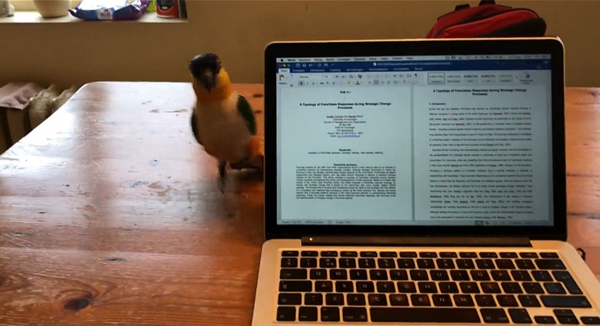 Malý papoušek dovádění na stůl se snaží upoutat pozornost vlastníka.