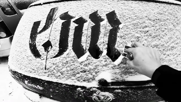 kaligrafa Peter Omelianiuk Polsko kaligrafie na zasněžených automobilových oken.