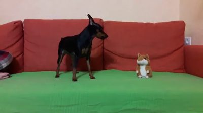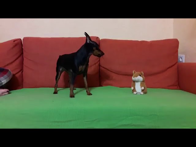 Vycpaný panenka dráždí psa, se opakuje, štěkání.