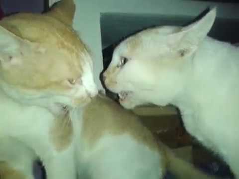 Ve městě Kalkata Indie, dvě kočky mají intenzivní hádku s hlasitými zvuky a křičí.