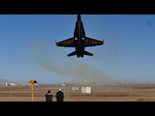 F-18 Hornet z demonstračního týmu „Blue Angels“ amerického letectva, provádí velmi nízkou letu a vyhozen do vzduchu znovu.