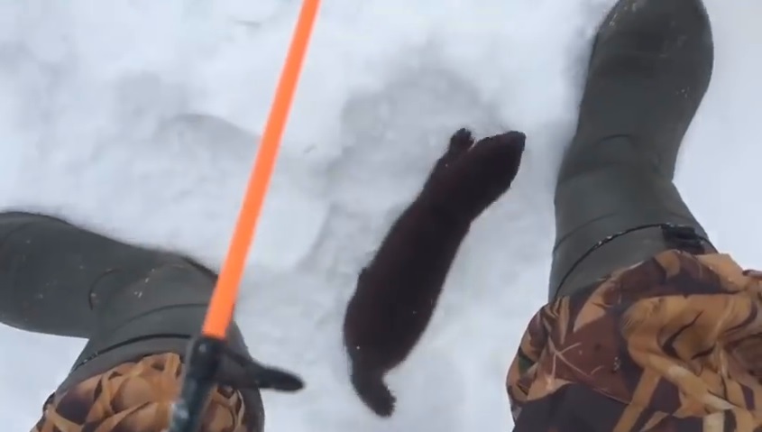 S nadbytkem troufalost, lasička v Rusku se blíží muž ryby na ledě se dostat některé ze své kořisti.
