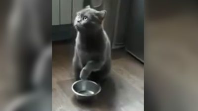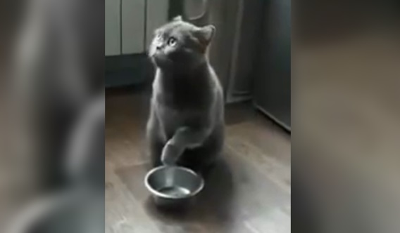 Kočka vypadá netrpělivě před prázdnou misku jídla.