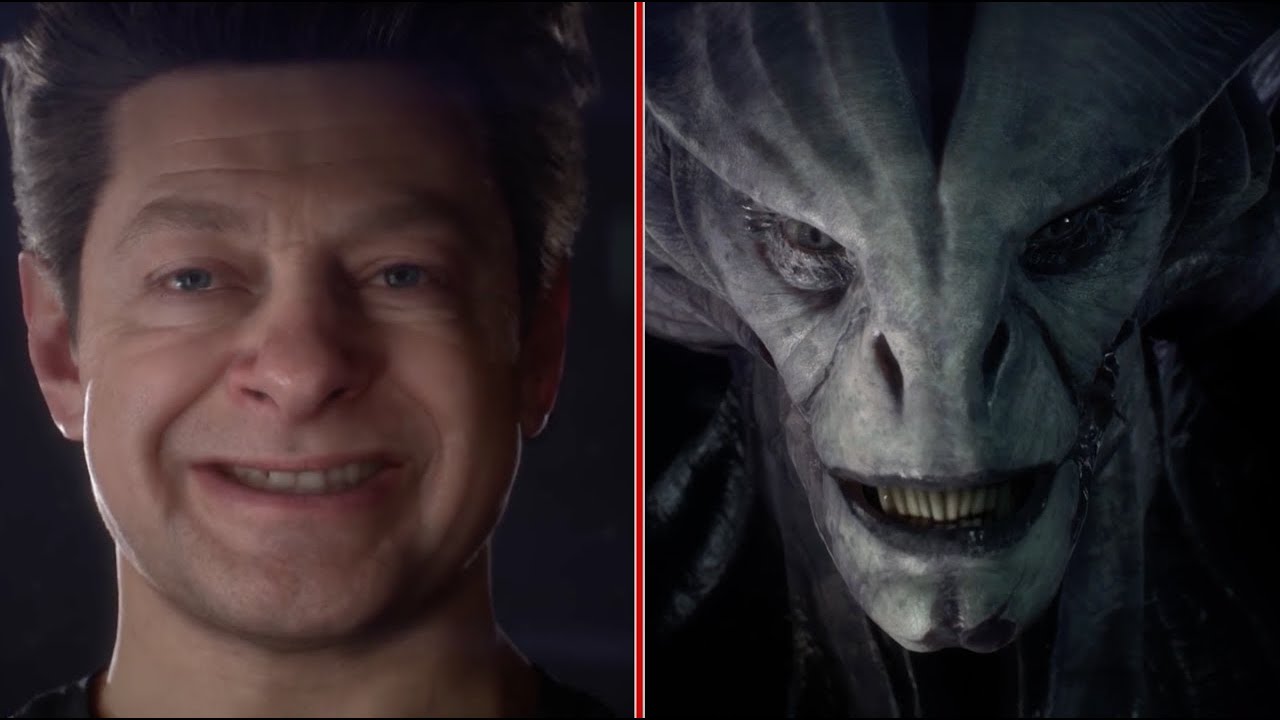 Herec Andy Serkis z nás dělá ukázku digitálního zobrazování v projevech osoby, pomocí nového grafického enginu Unreal Engine. Všimněte si, že levý obrázek je také trojrozměrný face. Demo konalo v výstavě GDC 2018 v San Francisku.