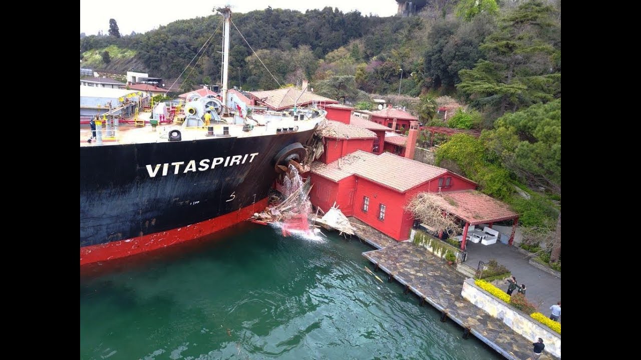 Nákladní Vitaspirit došlo k problému V jejím čele, který bere. Velkou loď absolvovalo v přední části historické osmanské vile z 19. století na Bosporu.