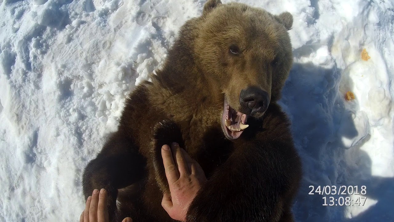 Andrei Ivanov z Ruska zkoumá jeho zuby Mansour, mladý medvěd, který žije v útočiště divoké zvěře.